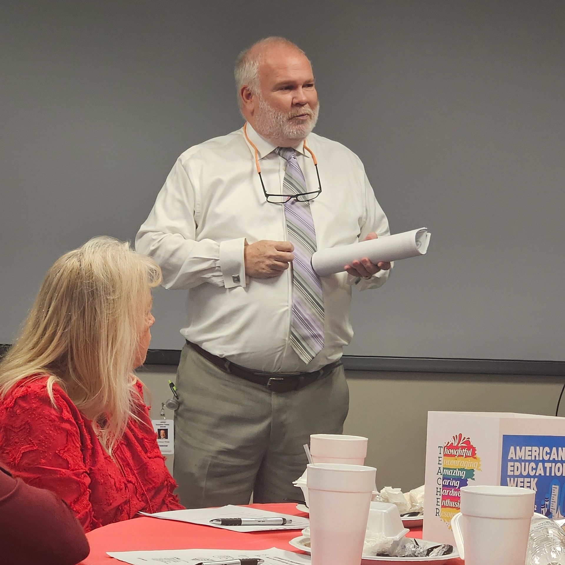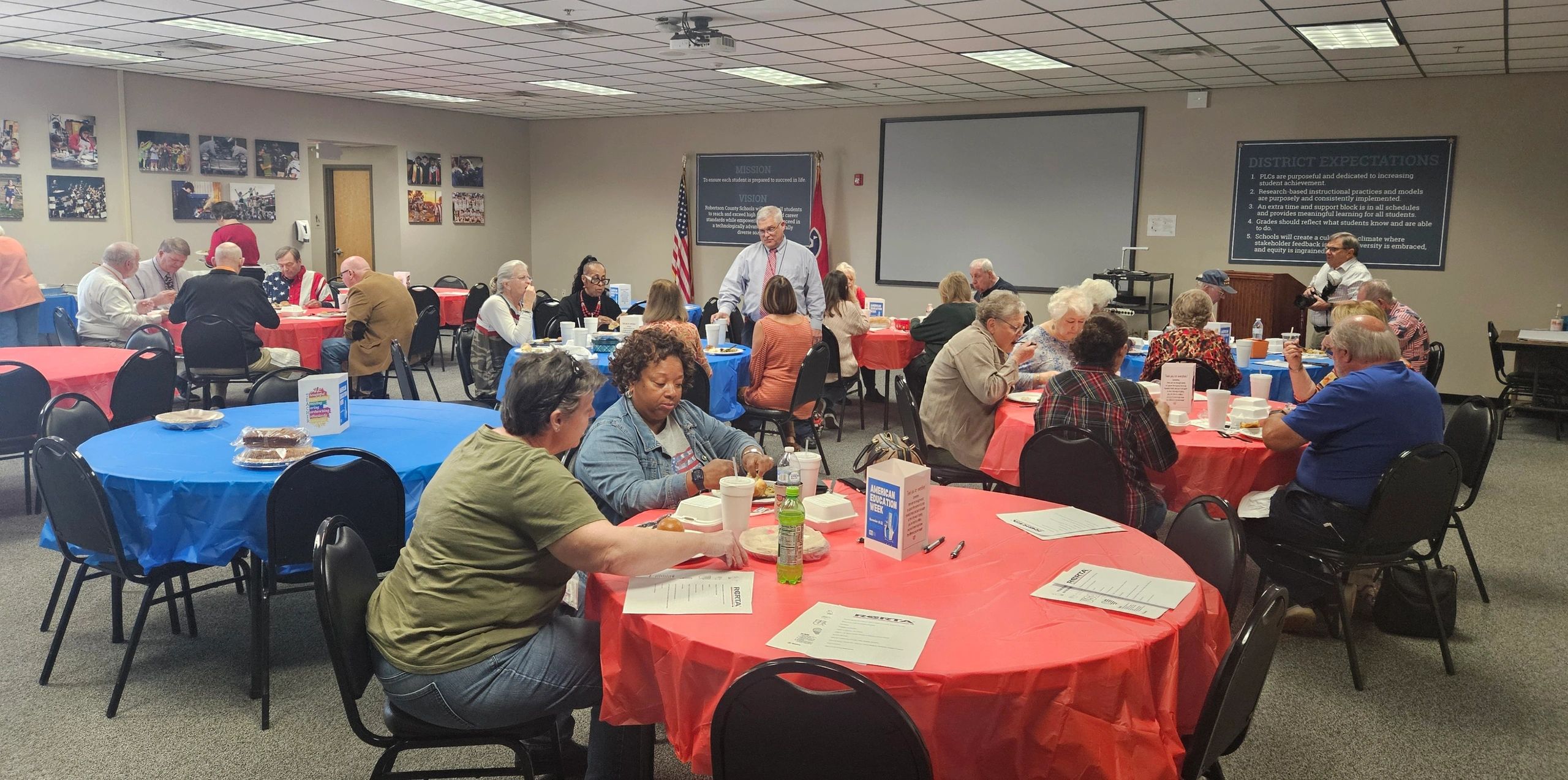November 2024--The RCRTA November meeting had much happening. We celebrated Veteran's Day; our Director of Schools gave a "State of the Schools" presentation, and we had a Bake Sale to fund our scholarship. Jerry Goodchild, a retired teacher and veteran, was present for our meeting and shared some of his personal experiences. Dr. Danny Weeks provided a handout about the Robertson County Schools and explained the info more in depth. The baked goods were gone very quickly. The picture provided does not do it justice, for so many things were bought and gone before the picture was taken. The meeting was held at the Robertson County Board of Education and lunch was a traditional Thanksgiving meal (yum).